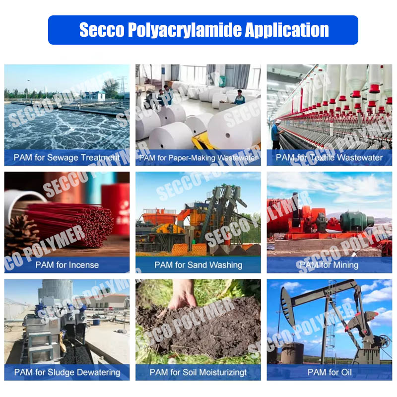 يستخدم مستحلب البولي أكريلاميد على نطاق واسع في مجموعة متنوعة من مياه الصرف الصحي المنزلية ومياه الصرف الصحي الكيميائية ومياه الصرف الصحي في حقول النفط وإزالة مياه الحمأة والورق وغيرها من المجالات. كما يستخدم مستحلب المياه في الزيت من البولي أكريلاميد على نطاق واسع في معالجة مياه الصرف الصحي الحضرية ومصنع البيرة ومصنع النشا ومصانع معالجة الأغذية ومعالجة مياه الصرف الصحي الأخرى. ويمكن التخلص بشكل خاص من تجمع المواد الصلبة المعلقة العضوية في مياه الصرف الصحي الحمضية أو الحمضية. في صناعة الورق ، يمكن استخدامها كمرشح مساعدة الاحتفاظ ، ومعالجة مياه الصرف الصحي لصناعة الورق. يمكن استخدام صناعة النفط كعامل طلاء مستحلب الحفر أو عامل إزالة الدهون.
